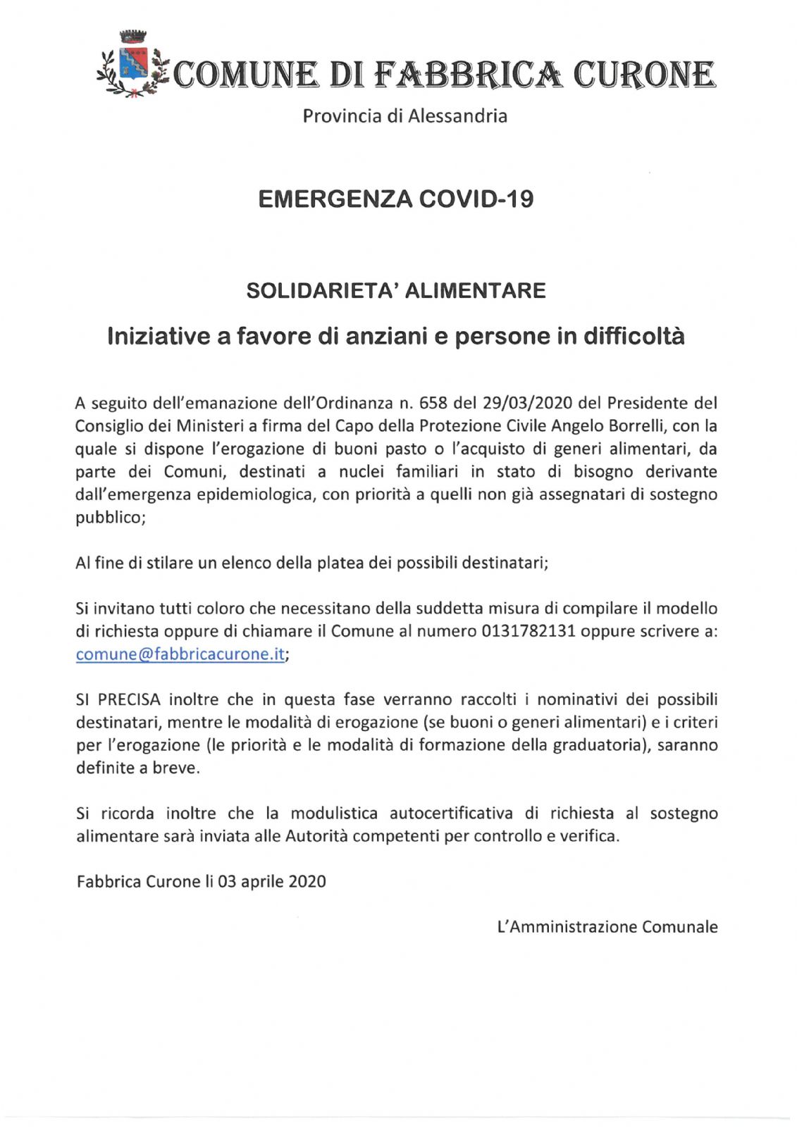 Solidarietà alimentare - Erogazione di buoni spesa a favore dei nuclei familiari più esposti agli effetti economici derivanti dall'emergenza epidemiologica da Covid-19.