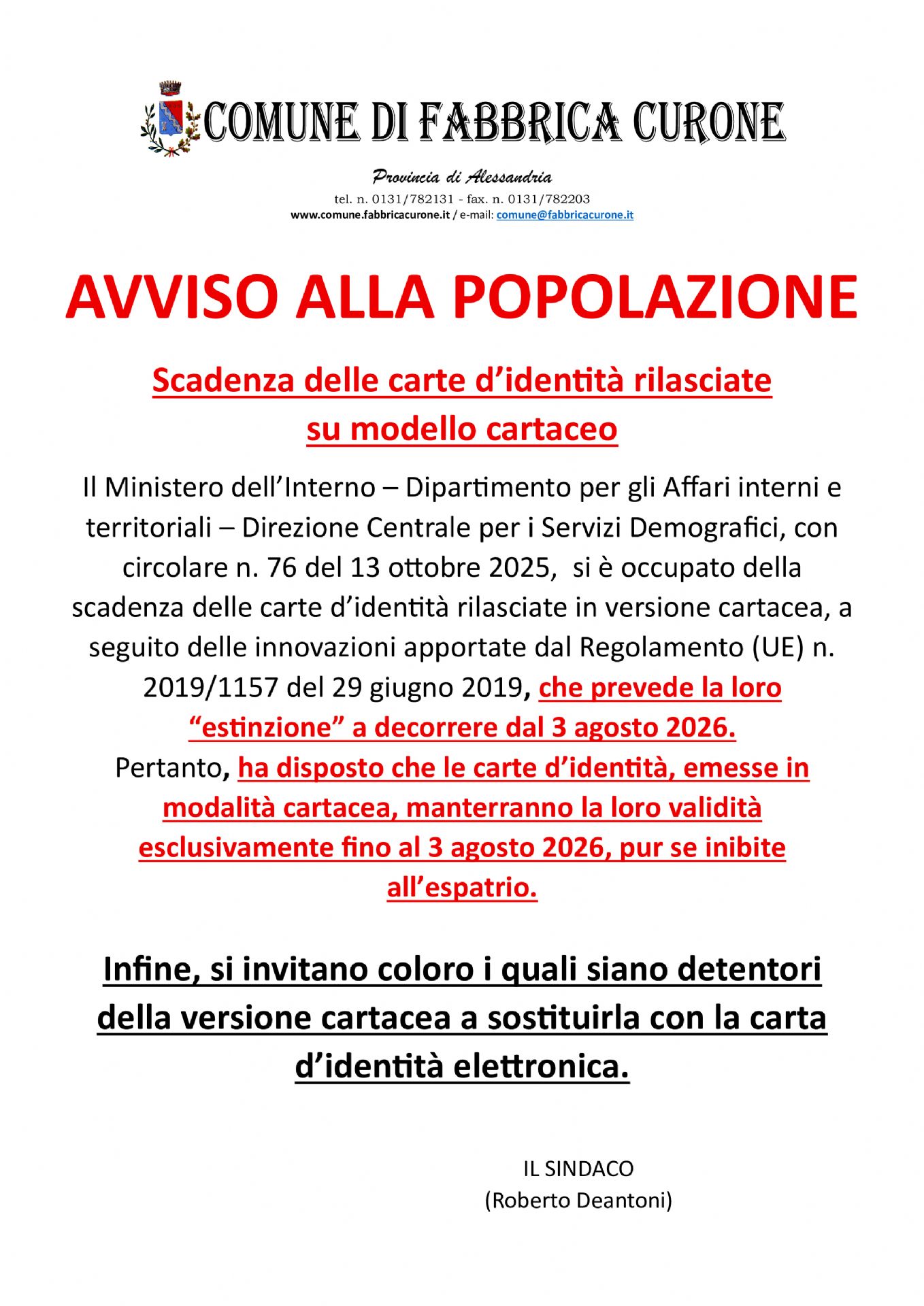 Avviso alla popolazione - scadenza carte identità formato cartaceo
