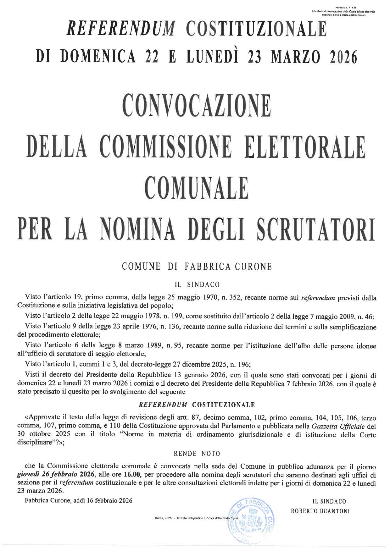 Convocazione della Commissione Elettorale Comunale per la Nomina degli Scrutatori