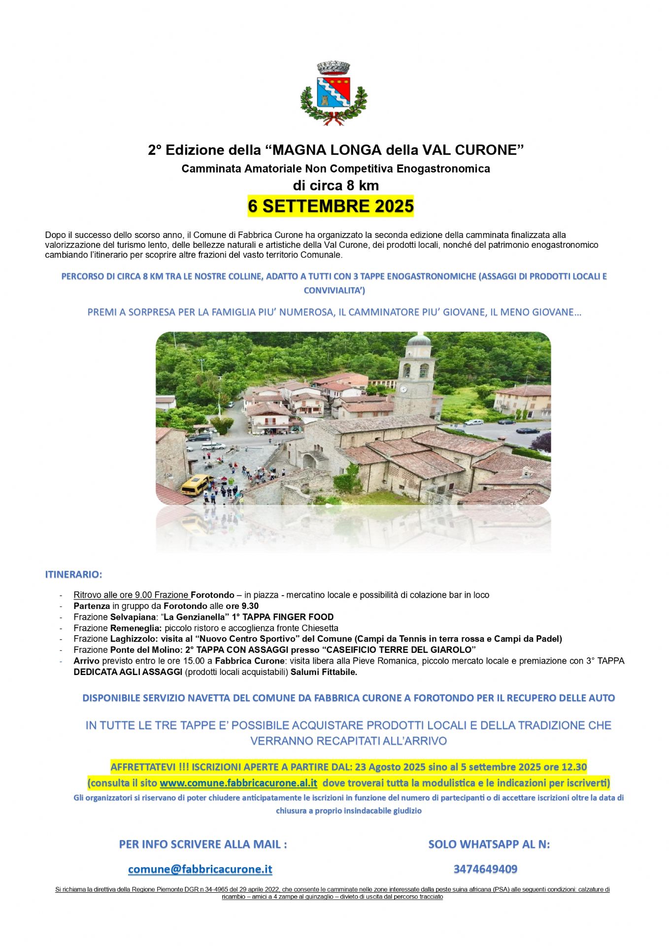 Il Comune di Fabbrica Curone ha organizzato la seconda edizione della camminata finalizzata alla valorizzazione del turismo lento, delle bellezze naturali e artistiche della Val Curone, dei prodotti locali, nonché del patrimonio enogastronomico cambiando l’itinerario per scoprire altre frazioni del vasto territorio Comunale